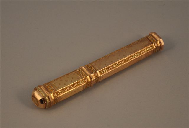 ÉTUI À CIRE à section octogonale en ors de plusieurs tons, gravé de chutes de culots, quartefeuilles et perles. (Petite bosse). PARIS, 1788. Maître-Orfèvre: illisible.