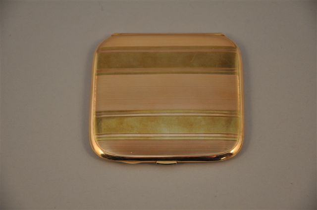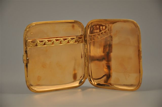 ÉTUI à cigarettes en ors de plusieurs tons, gravé de filets, le fermoir serti de pierres de synthèses bleues. Poids brut: 146 g.