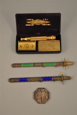 LOT comprenant: un RASOIR Gilette et son réceptacle pour lames en métal doré, dans son écrin, et deux COUPES-PAPIERS en forme d'épées dans leurs fourreaux ornés pour l'un de pierres vertes, et pour l'autre de pierres bleues.