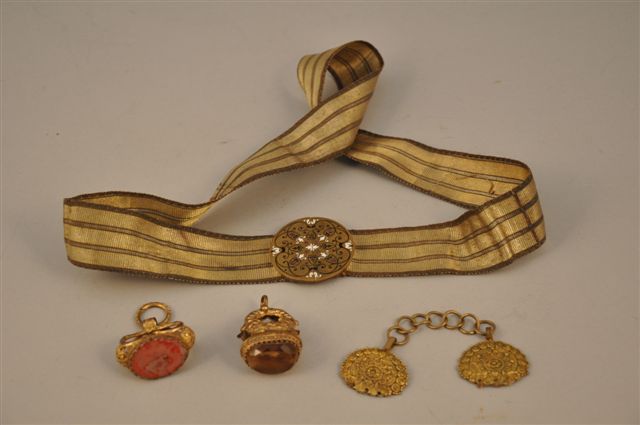 CEINTURE composée d'une boucle circulaire en laiton doré à décor centré émaillé en champlevé, noir et blanc, d'arabesques, et ornée de huit pierres rouges taillées. Ceinture en broché argent et or à rayures longitudinales. XIXème. Long. 74 cm.