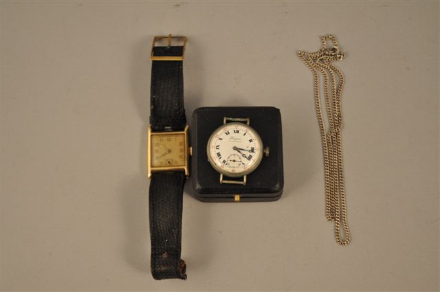 MONTRE BRACELET d'homme, à remontoir, boîtier de forme carré en métal doré, cadran à chiffres arabes, trotteuse à six heures, verre bombé