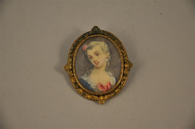 MINIATURE représentant un portrait de dame de qualité. Cadre en laiton doré et ciselé à motifs de coquilles et feuilles d'acanthe. Dans le style du XVIIIème. XIXème. Dim hors-tout: 4,5 x 4 cm.