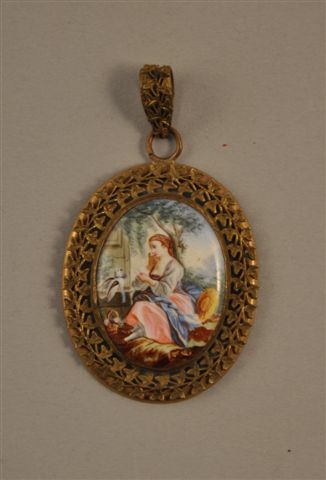 MINIATURE ovale en émail représentant une bergère à la lecture d'une lettre portée par un oiseau messager. Entourage et la bélière en laiton doré à frise de feuilles de lierre. XIXème. Haut. 3, Larg. 2,5 cm.