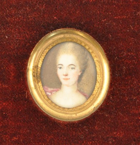 MINIATURE ovale sur ivoire. Madame Jeanne-Marie Cellard. Milieu du XVIIIème. Dans un cadre en velours du XIXème. Porte au dos une étiquette "Jeanne-Marie Cellard de (Montaclan)?, en 1754, épouse de Jean Baptiste Gaston d'Argout, seigneur de Vessilieux, grand mère du Comte Apollinaire d'Argout". 3 x 2 cm à vue.