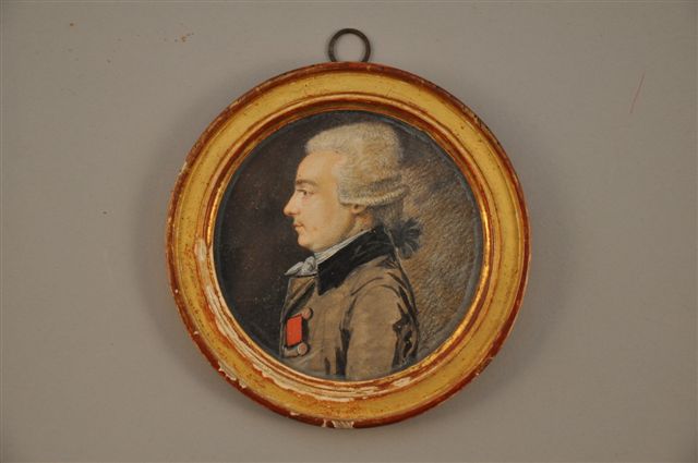 MINIATURE ronde sur papier. Gentilhomme de profil. Inscription manuscrite en partie illisible au dos: "...Champfleurie...Paris...le 15 mars 1786 "?. Paris Fin XVIIIème. Diam. 9 cm.