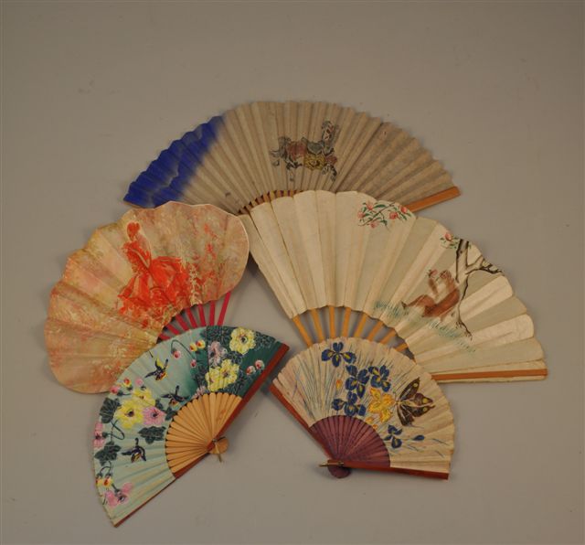 LOT comprenant QUATRE ÉVENTAILS pliés à monture en bambou naturel ou teinté. Pour le premier: feuille en papier à décor d'un cheval (Haut. 24 cm). Pour le deuxième: feuille en papier nacré à décor peint d'un singe au pied d'un arbre (Haut. 25,5 cm). Pour le troisième: feuille peinte à la gouache d'oiseaux et de fleurs (Haut. 15 cm). Pour le quatrième: feuille à décor de papillon et d'iris (Haut. 15 cm).