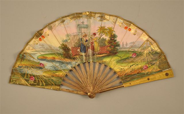 ÉVENTAIL plié, la monture en laiton doré, les brins ajourés de motifs circulaires en ligne, les panaches en bronze doré à motifs en semis de quatre-points. La feuille en papier lithographié rehaussée de gouache et d'aquarelle représentant trois femmes dans un paysage Moyen-oriental. Rivure en nacre. Vers 1850. Haut. 17,5, Larg. déployé: 33 cm (usures et reprises à la feuille). Joint: Ecrin d'éventail en cartonnage crème.
