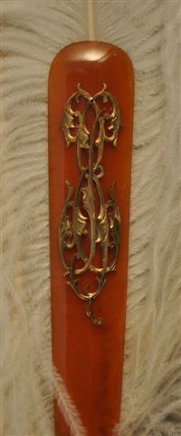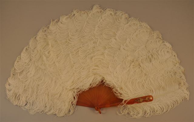 ÉVENTAIL à monture en corne blonde, panache orné du monogramme E.B. en métal doré, gravé et ciselé, appliqué de plumes d'autruche blanches, rivure en corne blonde.