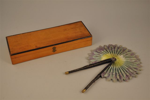 ÉCRAN brisé en forme de "roue", la monture en métal, feuille en toile imprimée à motifs rayonnants, marqué "Village Suisse 1900". Haut. 21,5 cm.