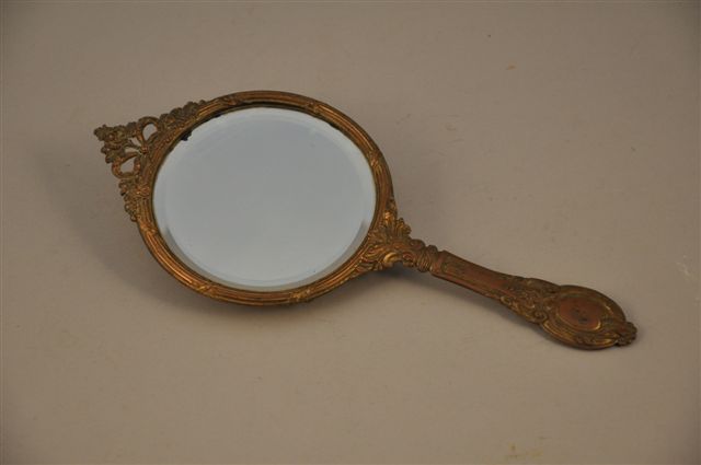 MIROIR à main en bronze doré, la glace circulaire biseautée, la monture à rubans croisés, noeud de ruban et fleur, manche feuillagé. Style Louis XVI. Fin XIXème. Haut. 27, Diam. de la glace:10 cm. (usures)
