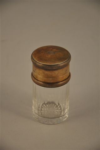 FLACON en cristal taillé à pans, monture en argent à double rang de godrons, couvercle à charnière gravé d'une couronne comtale. Haut. 8 cm