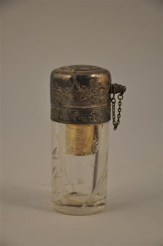 FLACON de TOILETTE. Atomiseur de parfum de forme cylindrique. Cristal gravé de fleurs, monture et mécanisme à système en bronze argenté ciselé d'un riche décor floral. Petit orifice diffuseur et bouchon vissant. Haut. 10,5 cm.