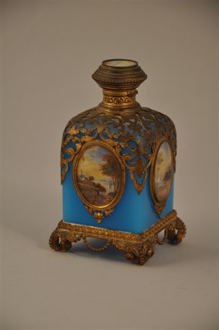 FLACON à parfum de forme quadrangulaire en opaline de couleur bleu. Monture en laiton doré composée d'une base à frise de raies de coeurs et rangs de perles reposant sur quatre pieds en volute feuillagée, et d'une résille ajourée, couvrant l'épaulement, à motifs de rinceaux gravés, présentant des médaillons ovales et rond en fixés sous verre sur les quatres face du corps et sur le bouchon à charnière, représentant des scènes de port ou champêtres, animées de personnages. XIXème. Haut. 13,5 cm.