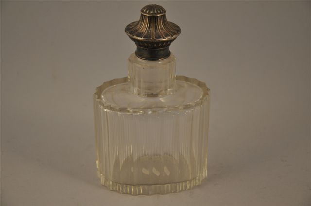 FLACON à PARFUM en verre à large pans, bouchon en métal argenté, godronné surmonté d' un motif de fleur. Haut. 17 cm.