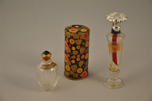 Lot de deux FLACONS de PARFUM comprenant: un FLACON de "Fleurettes" par Molinard à Grasse, en cristal de forme ovoïde godronné, bouchon en bakélite, dans son écrin de forme tubulaire à décor de fleurs polychromes, Haut. 7,5 cm. Un FLACON de "Fêtes" de Molyneux, en cristal, le bouchon en métal argenté marqué "M" dans une réserve de roses et de rubans. Haut. 12,5 cm.