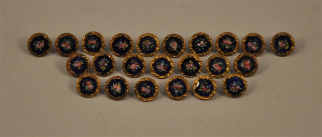 Suite de 23 BOUTONS ronds de robe ou de corsage en laiton doré à décor central émaillé de roses sur fond bleu, entourage feuillagé. Certains marqués au dos A P & C. PARIS.