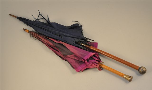 Lot comprenant: une OMBRELLE le pommeau godronné en argent, toile en satin (usures, déchirures)et une OMBRELLE le pommeau en argent de forme boule gravé de motifs végétaux dans des réserves, toile en satin (usures, déchirures, manques) Long. 83 et 102 cm.