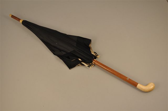 PARAPLUIE, le pommeau et divers éléments en ivoire, le mât en noyer, la toile en tissu imperméable. Travail de qualité de la maison Bétaille 40 rue Palais Royale. Long. 94 cm. (usures et déchirures)