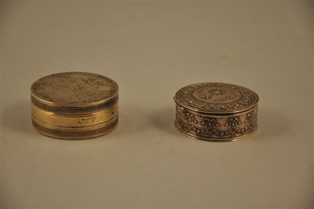 DEUX BOÎTES rondes en argent. La première uni à filets et stries verticales sur le flanc. La seconde à décor, sur le couvercle d'une large fleur épanouie dans un entourage d'une frise de fleurs, le flanc à guirlande florale nouée de rubans. Poinçon Minerve. Poids: 50 g.