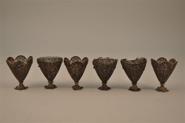 SIX RÉCEPTACLES sur pied en argent filigranné. Le pied polylobé et le corps conique. Motifs de volutes, application de motifs en relief. Travail Moyen-Oriental. Poids: 204 g. (petits accidents et manques).