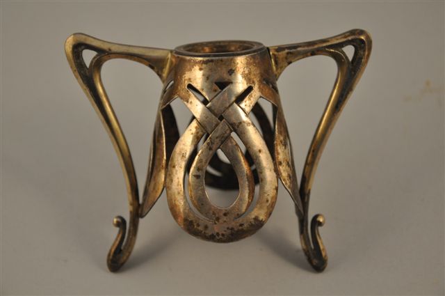 DÉCOR DE BOUTEILLE en argent, motifs circulaires ajourés, anses latérales en coup de fouet. Art Nouveau. Haut. 9, Larg. 11,5, Diam au goulot: 2 cm. Poids: 115 g.
