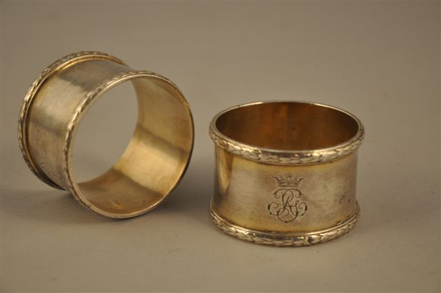 PAIRE de RONDS de SERVIETTE en argent uni, frise de laurier en bordure, monogrammé RG et AG surmonté d'un couronne de Marquis. Poinçon Minerve. XIXème. Poids: 95 g.