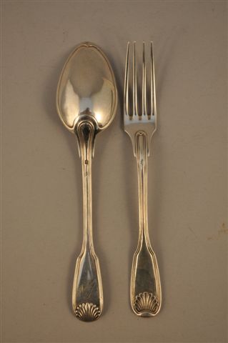 COUVERT en argent, modèle à filet coquille, cuilleron ourlé, tige gravée Mathieu. Poids: 107 g.