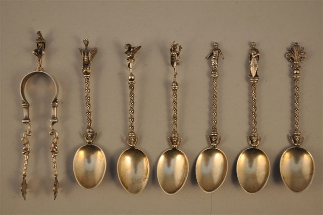 Suite de SIX CUILLÈRES à CAFÉ et une PINCE à SUCRE en argent. Tige torses, l'attache en figure ailée, extrémité sommée de sujets ou personnages en ronde-bosse: Mercure d'après Jean de Bologne, amour au dauphin, sphinge ailée, fleur de lys, Saint Georges d'après Donatello et personnage aux bras ouverts. Pince à sucre ornée de dauphins et fleurs de lys, marquée G. ACCARISTE FIRENZE. Travail italien. poids: 103 g.