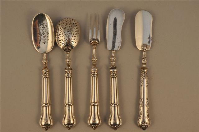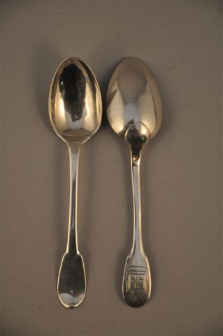 Suite de DEUX petites CUILLERES en argent, modèle uniplat, gravées d'un blason à la couronne de Marquis et de la devise 'Incit Verit'. Maître-orfèvre: RB. Poinçons effacés. XVIIIème. Poids: 41,7 g.