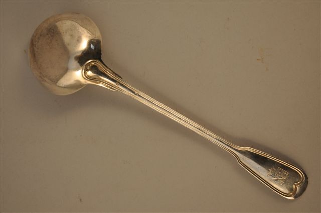 LOUCHE en argent, modèle à filets, gravé d'armoiries d'alliance surmontées d'une couronne de Marquis. Poinçon Minerve. XIXème. Poids: 190 g.