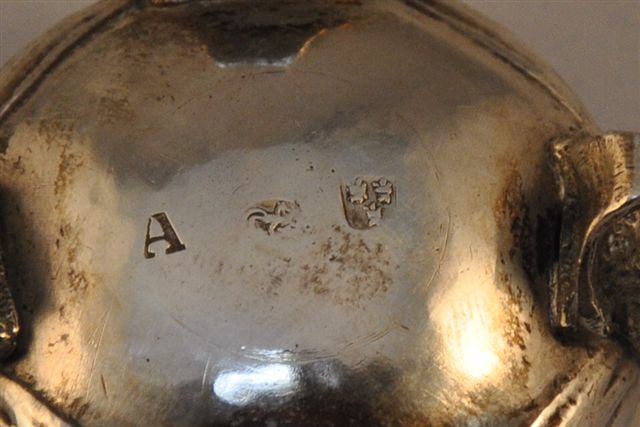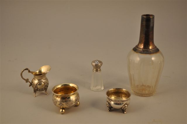 LOT de cinq pièces en argent comprenant: un SALERON circulaire reposant sur quatre pieds en volutes sommés de mascarons. Haut. 3, Diam. 4,5 cm. Un SALERON circulaire à décor de rubans reposant sur trois pieds boules. Poinçon de titre russe. Fin XIXème. Haut. 4, Diam. 5 cm. Une SALIÈRE en cristal, le bouchon orné de motifs géométriques. Poinçon Minerve. Haut. 6,5 cm. Un petit CRÉMIER orné de coquille et de rinceaux fleuris, l'anse en volute, repose sur quatre pieds cambrés. Haut. 6 cm. Un FLACON à PARFUM en cristal, la panse à cotes, monture en argent à décor d'une frise de feuilles d'eau. Poinçon Minerve. Haut. 17 cm. (accident au cristal sous la monture, manque le bouchon). Poids pour l'ensemble: 150 g.