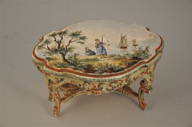 BONBONNIERE en faïence en forme de table ovale de style Louis XV, à entrejambe. Le plateau formant couvercle à décor polychrome de deux femmes pêchant sur une côte. Marquée CA 242 en vert. Haut. 11, Long. 21, Larg. 14 cm.
