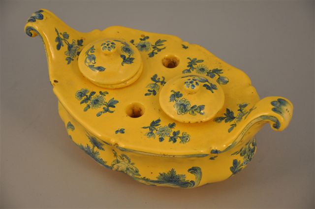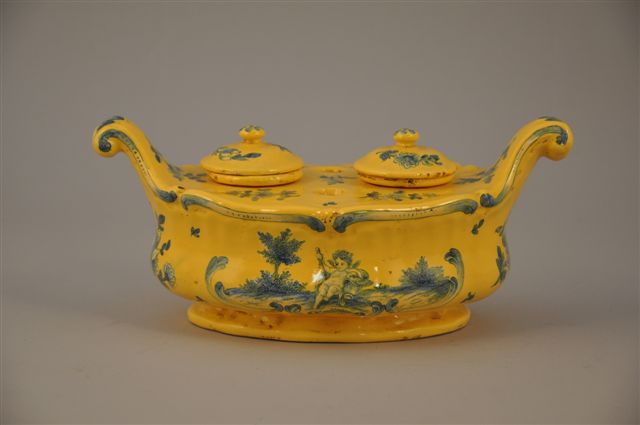 MIDI de la FRANCE. ENCRIER double ovale en faïence à fond jaune. De forme mouvementée sur piédouche, volutes latérales. Décor de grand feu en camaieu de bleu, sur les deux faces, d'un angelot dans un paysage. Le dessus à décor de fleurs stylisées. Deux godets avec leur couvercle. Marqué AR ou VP en bleu. XIXème. Haut. 11,5, Long. 26, Larg. 14,5 cm.