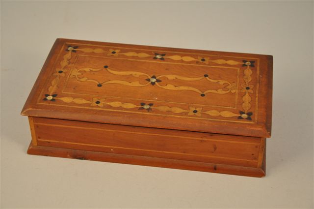 COFFRET rectangulaire en bois naturel, le corps incrusté de filets, le couvercle incrusté de motifs floraux stylisées en bois teinté et nacre. XIXème. Haut. 6, Long. 23,5, Larg. 13 cm.