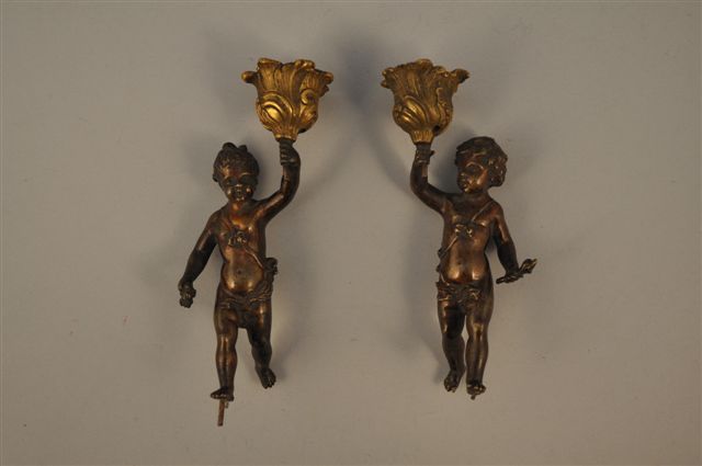 DEUX FLAMBEAUX composés chacun d'un chérubin en bronze patiné tenant un binet en bronze doré ciselé et amati. Style Louis XV. XIXème. Haut. 15 cm (binets percés, manque la base)