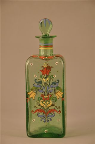 CARAFE verre soufflé de couleur verte, de section quadrangulaire, à décor polychrome, sur les quatre faces de candélabres fleuris et branches de chêne, bouchon en sphère aplatie. Haut. 29,5 cm.