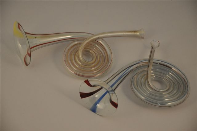 DEUX TROMPES en verre soufflé et étiré, l'une à filets pourpre et bleu, l'autre à filets rouges et jaunes. VENISE ou MURANO (?). Long. 26 et 32 cm (fêle à l'une).