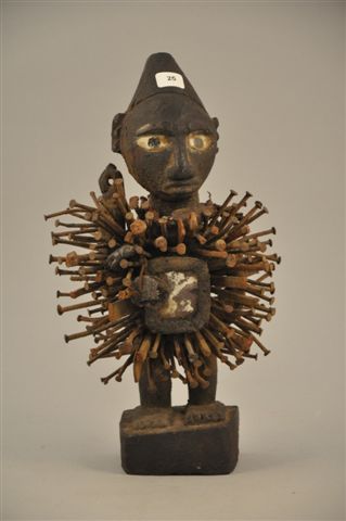 COPIE D'UN FETICHE à clous. Bois recouvert d'un enduit croûteux, yeux en verre.