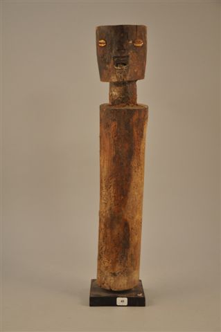 POTEAU-FETICHE en bois sculpté au sommet d'un visage, patine sacrificielle, yeux incrustés d'un cauris.