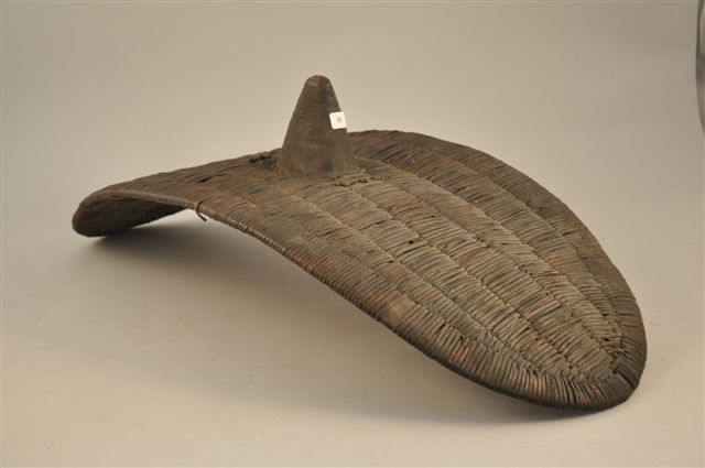 BOUCLIER ovale arqué en bois avec umbo. Il est recouvert d'un lacis d'écorce de palmier à patine croûteuse noire. Poignée en bois