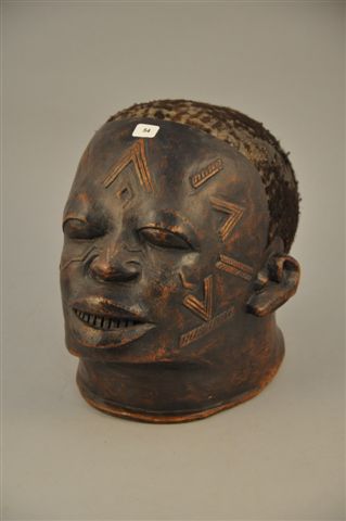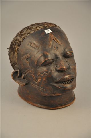 MASQUE-CASQUE en bois sculpté d'un visage de style réaliste. Calotte crânienne piquée de cheveux humains.