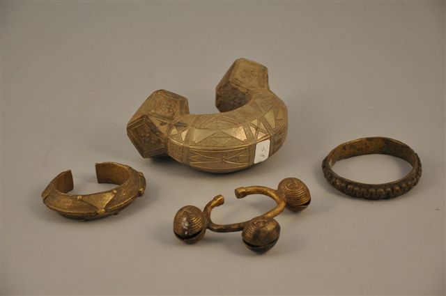 LOT DE QUATRE BRACELETS en bronze dont un à sonnailles