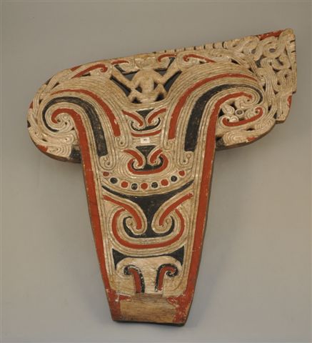 BRISE-LAMES en bois à beau décor gravé et sculpté d'un personnage, de serpents et de motifs divers, fonds de colorants végétaux rouge, blanc et noir