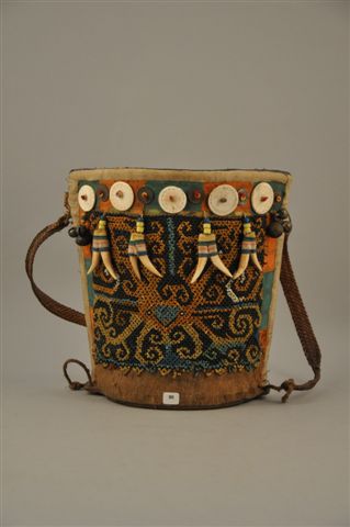 PORTE-BÉBÉ en bois, toile, travail de perlage, dents d'animaux, grelots en bronze, pièces de monnaie et opercule de coquillage marin.