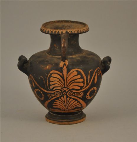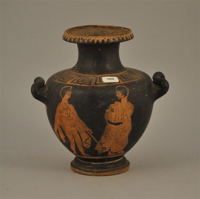 HYDRIE à figure rouge peinte de deux personnages et de rosaces