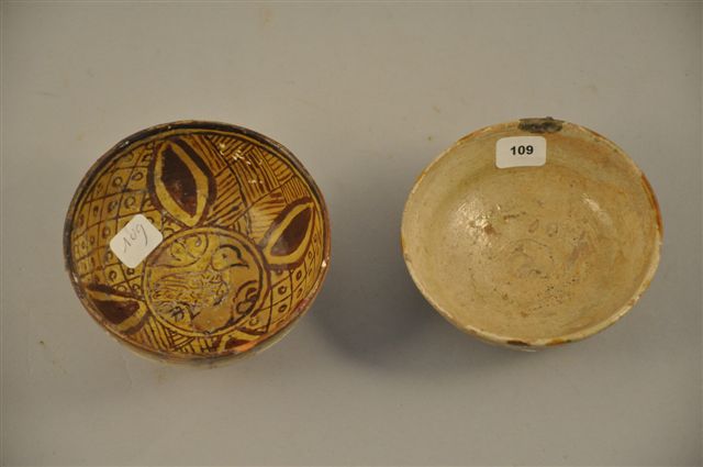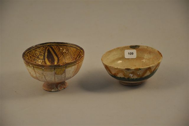 TROIS BOLS sur pied en terre émaillée beige et marron, l'un d'eux à décor d'oiseaux