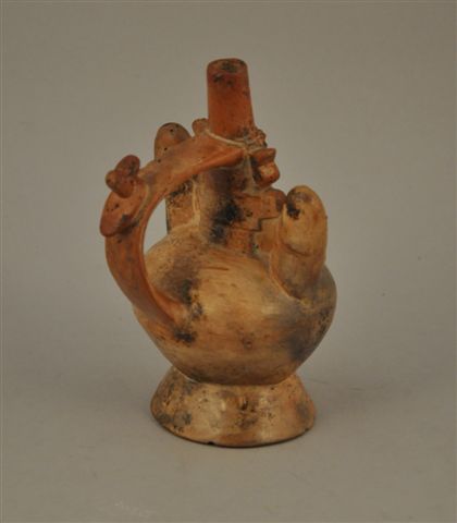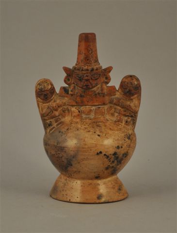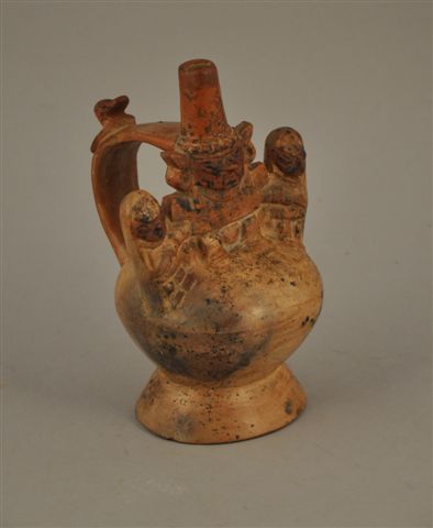 VASE-BOUTEILLE. Terre cuite à engobe beige et rouge: divinité formant le goulot flanquée de deux personnages, à l'arrière anse en étrier ornée d'un oiseau.