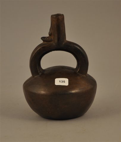 VASE-BOUTEILLE. Terre cuite noire graphitée, petit animal sur l'épaulement de l'anse en étrier.