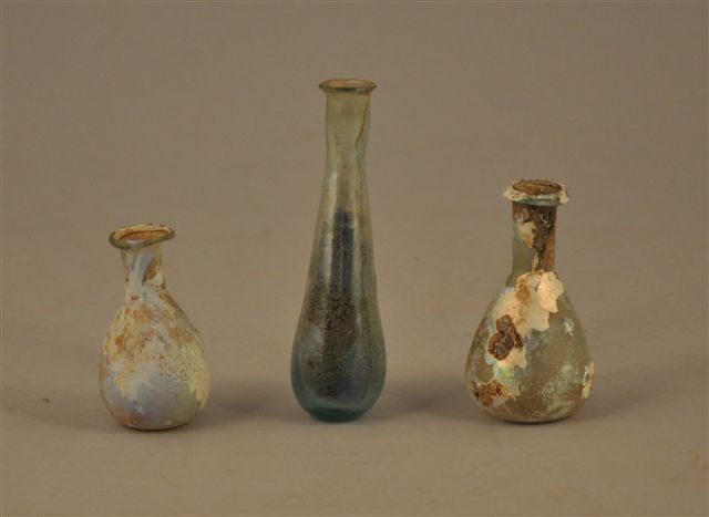 TROIS BOUTEILLES en verre irisé d'époque romaine, l'une d'elles cassée.