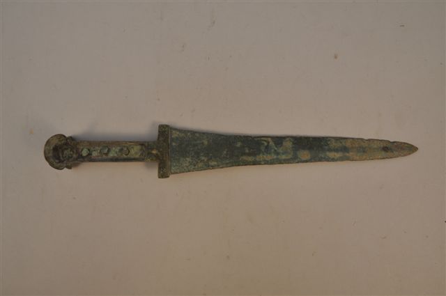 ÉPÉE courte ou poignard. Bronze patine verte et brune.
